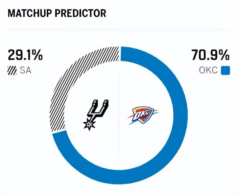 赛前,美媒ESPN对本场比赛进行了胜率预测,马刺队胜率仅有29.1%,依旧不被看好,雷霆队胜率则高达70.9% ,显然美媒都看好雷霆本场能够打破“魔咒” ,完成复仇之战。