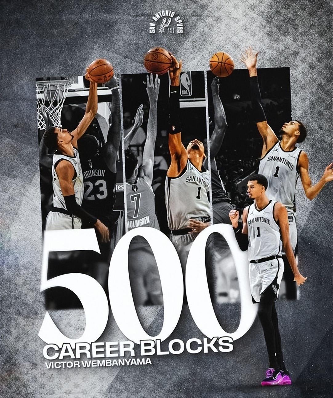 值得一提的是,文班亚马生涯盖帽数已经达到500,NBA历史第二年轻,用时143场历史第四快。